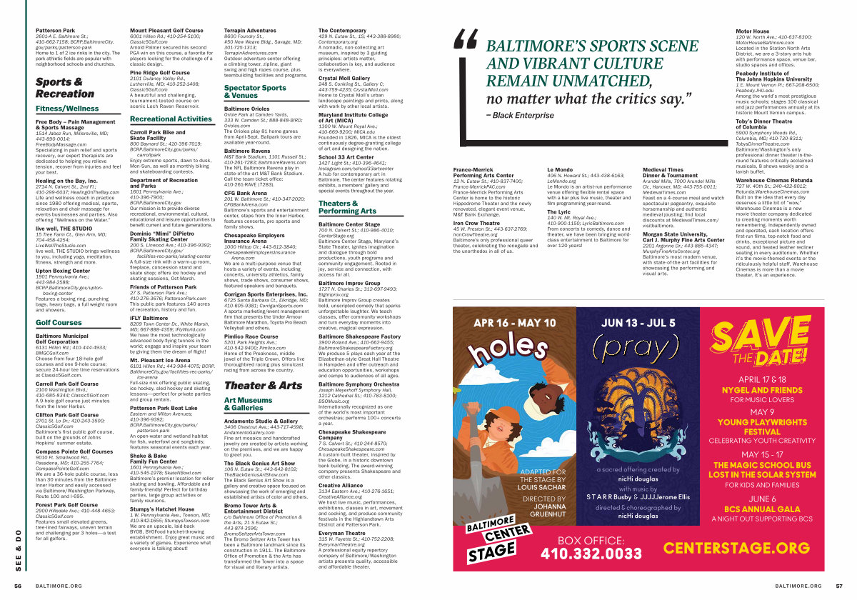 Baltimore Center Stage 700 N. Calvert St.; 410-986-4010; CenterStage. org Baltimore Center Stage, Maryland’ s State Theater, ignites imagination and dialogue through bold productions, youth programs and community engagement. Rooted in joy, service and connection, with access for all.