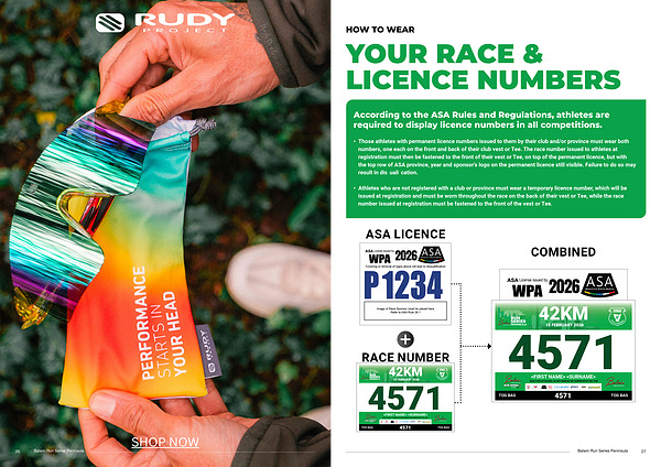 • Those athletes with permanent licence numbers issued to them by their club and / or province must wear both numbers, one each on the front and back of their club vest or Tee. The race number issued to athletes at registration must then be fastened to the front of their vest or Tee, on top of the permanent licence, but with the top row of ASA province, year and sponsor’ s logo on the permanent licence still visible. Failure to do so may result in disqualification.