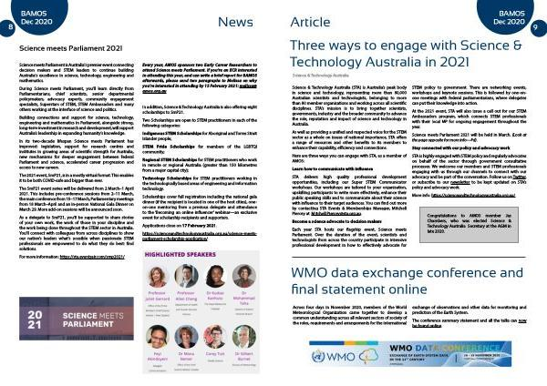 More info : https :// scienceandtechnologyaustralia . org . au / Congratulations to AMOS member Jas Chambers , who was elected Science & Technology Australia Secretary at the AGM in late 2020 . WMO data exchange conference and final statement online