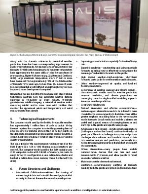 The peak speed of the supercomputer currently used by the BoM( Figure 5) is 1.66 × 1015 floating point operations per second 3. The computer model used by the BoM typically uses 2160 computer nodes with 128 GB of memory per node. In rough terms, this configuration is one million times faster and has half a million times more memory than a fast home PC( in 2016).