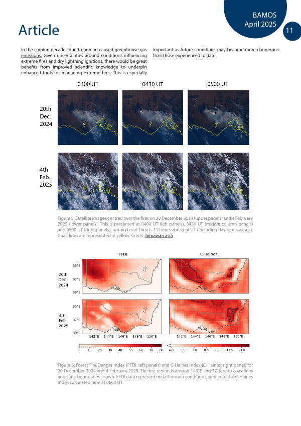 Figure 5: Satellite images centred over the fires on 20 December 2024( upper panels) and 4 February 2025( lower panels). This is presented at 0400 UT( left panels), 0430 UT( middle column panels) and 0500 UT( right panels), noting Local Time is 11 hours ahead of UT( including daylight savings). Coastlines are represented in yellow. Credit: himawari asia