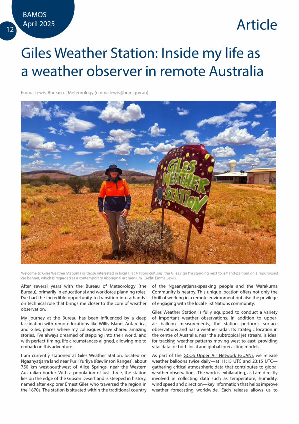 I am currently stationed at Giles Weather Station, located on Ngaanyatjarra land near Purli Yurliya( Rawlinson Ranges), about 750 km west-southwest of Alice Springs, near the Western Australian border. With a population of just three, the station lies on the edge of the Gibson Desert and is steeped in history, named after explorer Ernest Giles who traversed the region in the 1870s. The station is situated within the traditional country of the Ngaanyatjarra-speaking people and the Warakurna Community is nearby. This unique location offers not only the thrill of working in a remote environment but also the privilege of engaging with the local First Nations community.