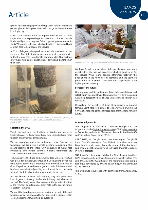 CSIRO, IMAS, and Google researchers are using two Google AI tools- DeepConsensus and DeepVariant- to analyse surviving Giant Kelp to understand what makes some of it heat resistant and ensure genetic diversity and increased thermal tolerance in restored forests.
