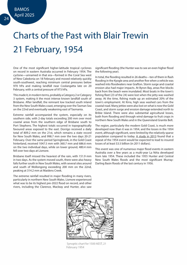 This event was one of numerous major flood events in eastern Australia over a few years as a multi-year La Niña developed from late 1954. These included the 1955 Hunter and Central New South Wales floods and the most significant Murray- Darling Basin floods of the last century in 1956.