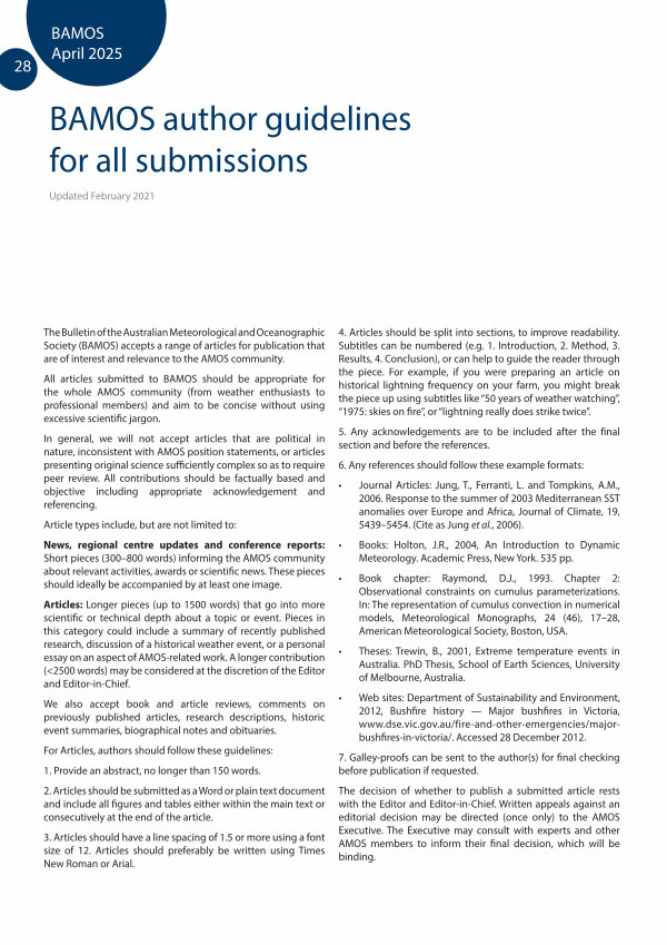 The Bulletin of the Australian Meteorological and Oceanographic Society( BAMOS) accepts a range of articles for publication that are of interest and relevance to the AMOS community.