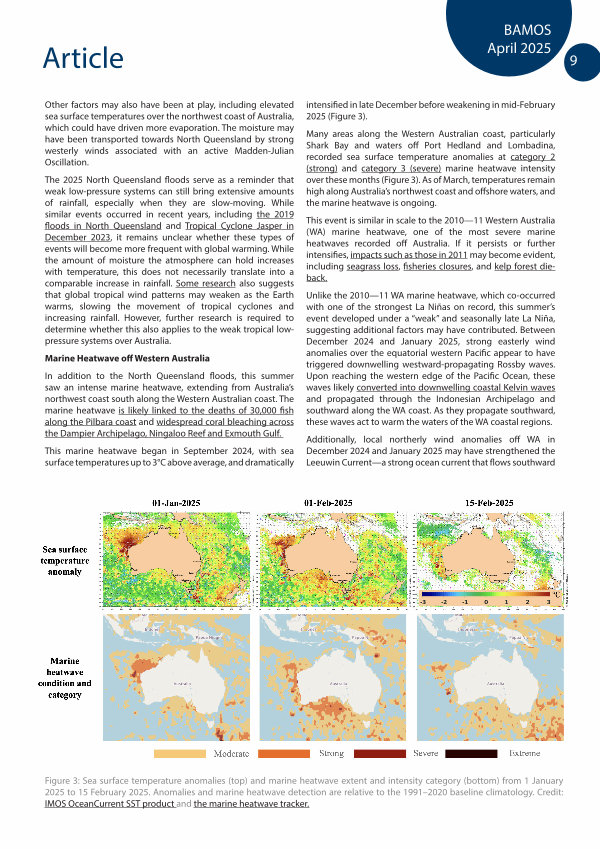 Additionally, local northerly wind anomalies off WA in December 2024 and January 2025 may have strengthened the Leeuwin Current— a strong ocean current that flows southward