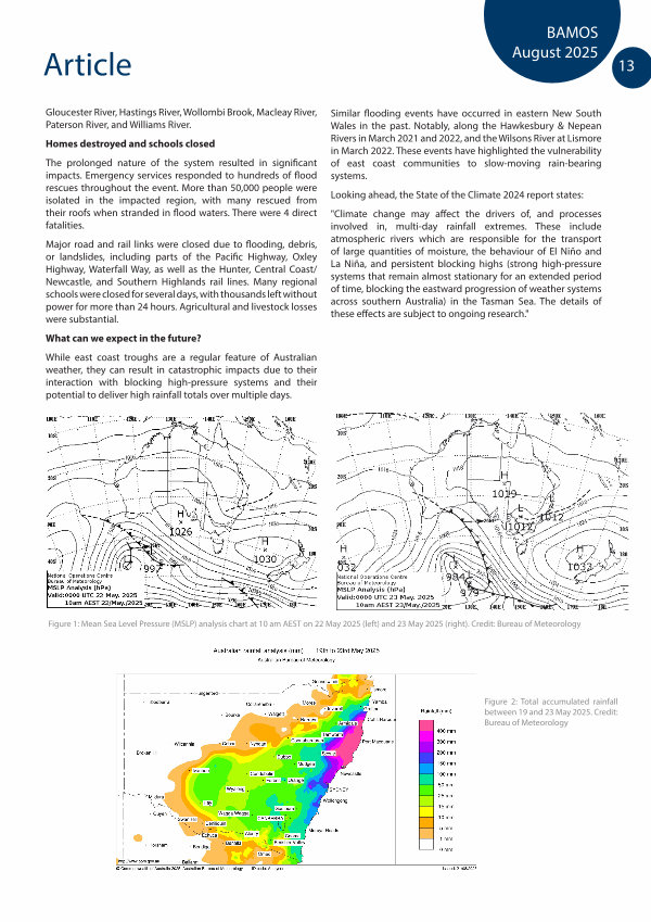 Similar flooding events have occurred in eastern New South Wales in the past. Notably, along the Hawkesbury & Nepean Rivers in March 2021 and 2022, and the Wilsons River at Lismore in March 2022. These events have highlighted the vulnerability of east coast communities to slow-moving rain-bearing systems.