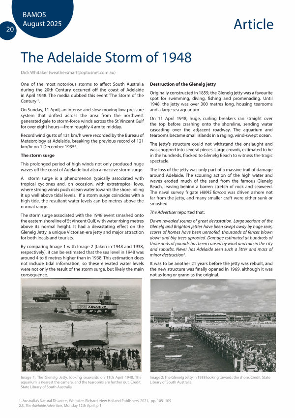The storm surge associated with the 1948 event smashed onto the eastern shoreline of St Vincent Gulf, with water rising metres above its normal height. It had a devastating effect on the Glenelg Jetty, a unique Victorian-era jetty and major attraction for both locals and tourists.