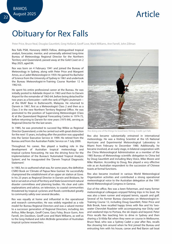 Rex Falls PSM, Honorary AMOS Fellow, distinguished tropical analyst, forecaster, mentor, and universally admired long-time Bureau of Meteorology Regional Director for the Northern Territory and Queensland, passed away at the Gold Coast on 2 May 2025, aged 84.