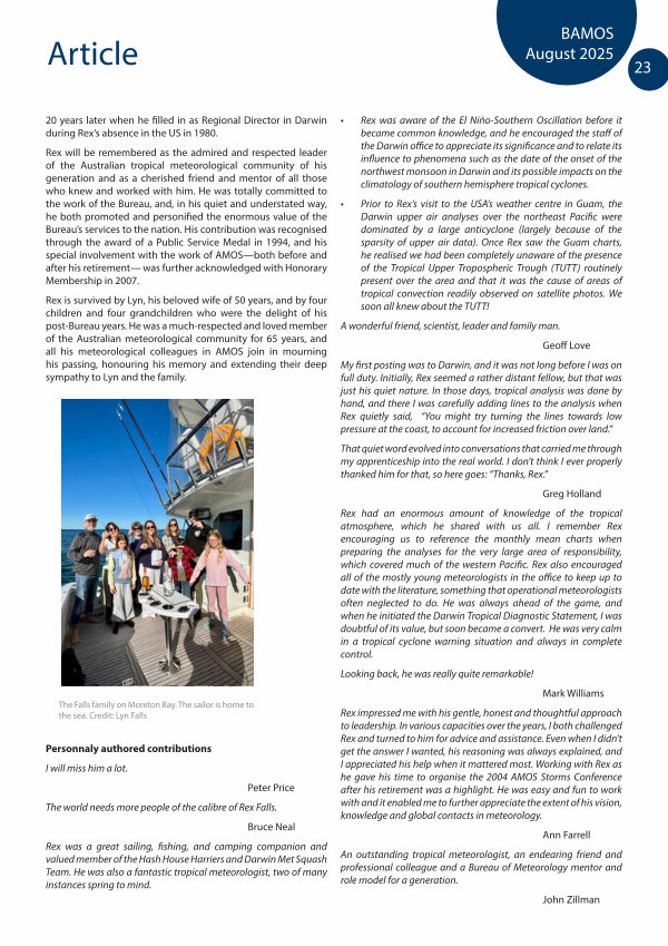 Rex is survived by Lyn, his beloved wife of 50 years, and by four children and four grandchildren who were the delight of his post-Bureau years. He was a much-respected and loved member of the Australian meteorological community for 65 years, and all his meteorological colleagues in AMOS join in mourning his passing, honouring his memory and extending their deep sympathy to Lyn and the family.