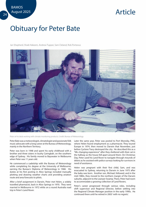 Peter Bate was a meteorologist, climatologist and passionate folk music advocate with a long career at the Bureau of Meteorology, mainly in the Northern Territory.