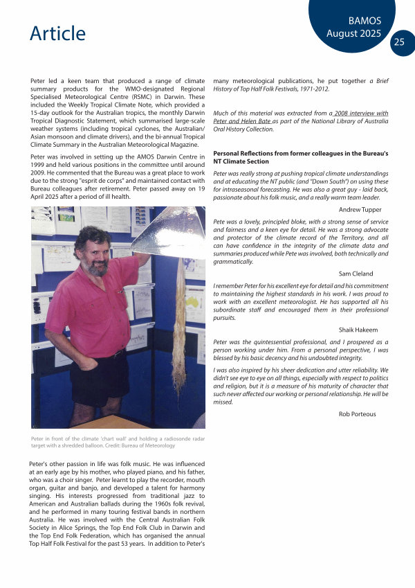 Peter was involved in setting up the AMOS Darwin Centre in 1999 and held various positions in the committee until around 2009. He commented that the Bureau was a great place to work due to the strong " esprit de corps " and maintained contact with Bureau colleagues after retirement. Peter passed away on 19 April 2025 after a period of ill health. many meteorological publications, he put together a Brief History of Top Half Folk Festivals, 1971-2012.