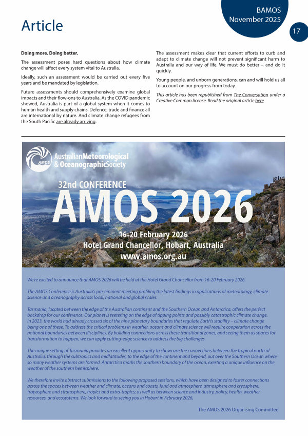 We therefore invite abstract submissions to the following proposed sessions, which have been designed to foster connections across the spaces between weather and climate, oceans and coasts, land and atmosphere, atmosphere and cryosphere, troposphere and stratosphere, tropics and extra-tropics; as well as between science and industry, policy, health, weather resources, and ecosystems. We look forward to seeing you in Hobart in February 2026,