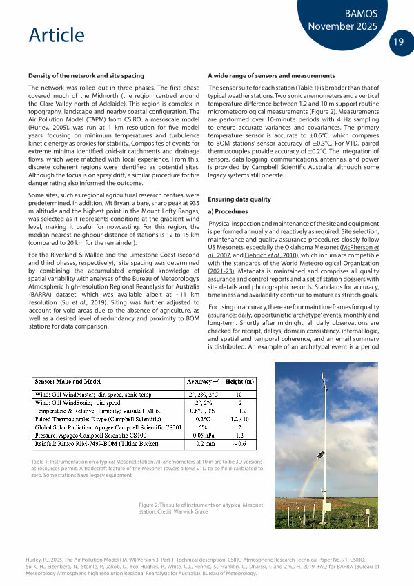 Physical inspection and maintenance of the site and equipment is performed annually and reactively as required. Site selection, maintenance and quality assurance procedures closely follow US Mesonets, especially the Oklahoma Mesonet( McPherson et al., 2007, and Fiebrich et al., 2010), which in turn are compatible with the standards of the World Meteorological Organization( 2021-23). Metadata is maintained and comprises all quality assurance and control reports and a set of station dossiers with site details and photographic records. Standards for accuracy, timeliness and availability continue to mature as stretch goals.