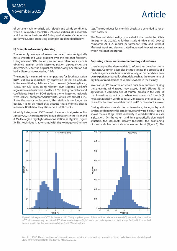 Monthly histograms of VTD reveal characteristic signatures. For January 2021, histograms for a group of stations in the Riverland & Mallee region highlight Alawoona station as atypical( Figure 3). This technique is automated with the Kolmogorov-Smirnov test. The techniques for monthly checks are extended to longterm datasets.