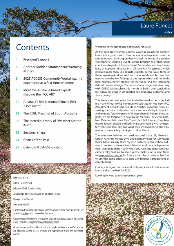 As the days grow warmer and we slowly approach the summer break, it is a good time to look back at what happened over the spring months. Early September marked the onset of a sudden stratospheric warming event, which brought drier-than-usual conditions to parts of the southeast. September also saw the release of Australia ' s first National Climate Risk Assessment, which involved more than 250 climate experts. In this issue, three of these experts— Andrew Watkins, Lucas Walsh and Tas van Ommen— share the key findings of this report, which will no doubt help Australia better prepare for the future and the increasing risks of climate change. The international stage was also busy, with COP30 taking place this month in Belém and concluding last Friday, resulting in yet another mix of positive outcomes and shortcomings.