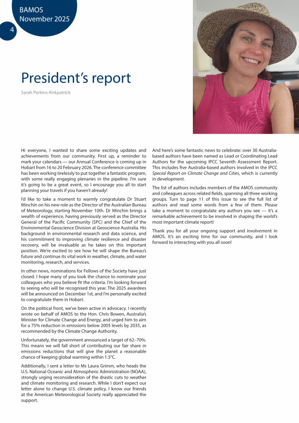 Hi everyone, I wanted to share some exciting updates and achievements from our community. First up, a reminder to mark your calendars— our Annual Conference is coming up in Hobart from 16 to 20 February 2026. The conference committee has been working tirelessly to put together a fantastic program, with some really engaging plenaries in the pipeline. I’ m sure it’ s going to be a great event, so I encourage you all to start planning your travels if you haven’ t already!