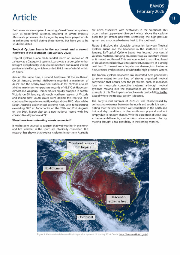 Figure 2 displays this plausible connection between Tropical Cyclone Luana and the heatwave in the southeast. On 27 January, Ex-Tropical Cyclone Luana was located over central Western Australia, bringing abundant tropical moisture inland as it moved southward. This was connected to a striking band of cloud oriented northwest to southeast, indicative of a strong cold front. To the east was a largely cloud-free region of extreme heat, created by descending air within the high-pressure system.