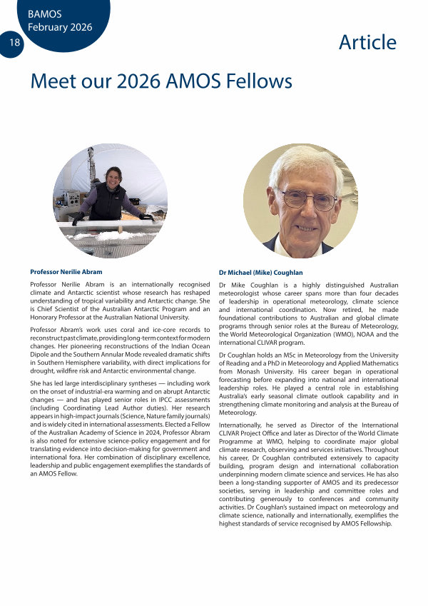 She has led large interdisciplinary syntheses— including work on the onset of industrial-era warming and on abrupt Antarctic changes— and has played senior roles in IPCC assessments( including Coordinating Lead Author duties). Her research appears in high-impact journals( Science, Nature family journals) and is widely cited in international assessments. Elected a Fellow of the Australian Academy of Science in 2024, Professor Abram is also noted for extensive science-policy engagement and for translating evidence into decision-making for government and international fora. Her combination of disciplinary excellence, leadership and public engagement exemplifies the standards of an AMOS Fellow.