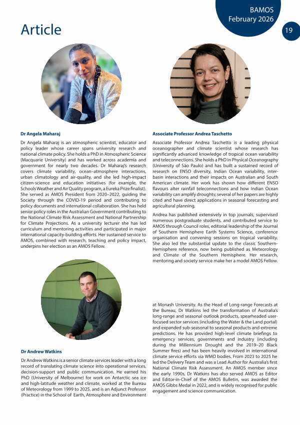 Dr Andrew Watkins is a senior climate services leader with a long record of translating climate science into operational services, decision-support and public communication. He earned his PhD( University of Melbourne) for work on Antarctic sea ice and high-latitude weather and climate, worked at the Bureau of Meteorology from 1999 to 2025, and is an Adjunct Professor( Practice) in the School of Earth, Atmosphere and Environment at Monash University. As the Head of Long-range Forecasts at the Bureau, Dr Watkins led the transformation of Australia’ s long-range and seasonal outlook products, spearheaded userfocused sector services( including the Water & the Land portal) and expanded sub-seasonal to seasonal products and extreme predictions. He has provided high-level climate briefings to emergency services, governments and industry( including during the Millennium Drought and the 2019 – 20 Black Summer fires) and has been heavily involved in international climate service efforts via WMO bodies. From 2023 to 2025 he led the Delivery Team and was a Lead Author for Australia’ s first National Climate Risk Assessment. An AMOS member since the early 1990s, Dr Watkins has also served AMOS as Editor and Editor-in-Chief of the AMOS Bulletin, was awarded the AMOS Gibbs Medal in 2022, and is widely recognised for public engagement and science communication.