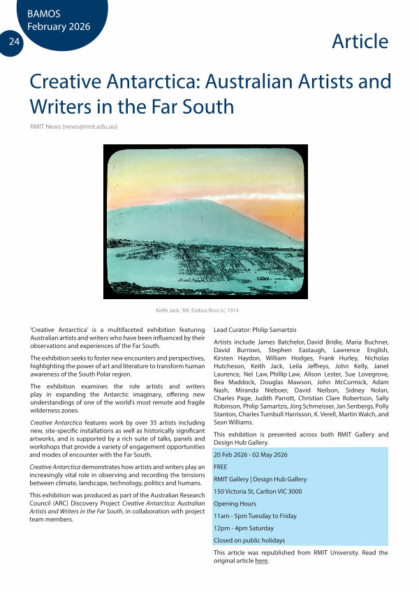 Creative Antarctica features work by over 35 artists including new, site-specific installations as well as historically significant artworks, and is supported by a rich suite of talks, panels and workshops that provide a variety of engagement opportunities and modes of encounter with the Far South.