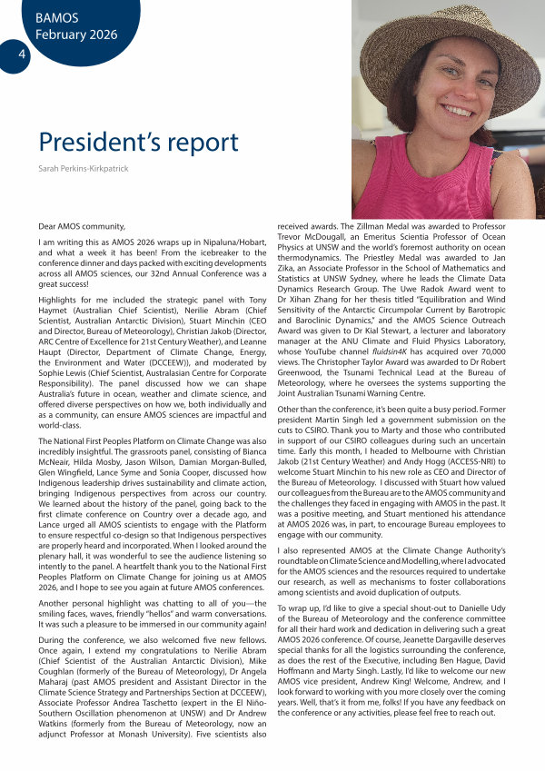 Other than the conference, it’ s been quite a busy period. Former president Martin Singh led a government submission on the cuts to CSIRO. Thank you to Marty and those who contributed in support of our CSIRO colleagues during such an uncertain time. Early this month, I headed to Melbourne with Christian Jakob( 21st Century Weather) and Andy Hogg( ACCESS-NRI) to welcome Stuart Minchin to his new role as CEO and Director of the Bureau of Meteorology. I discussed with Stuart how valued our colleagues from the Bureau are to the AMOS community and the challenges they faced in engaging with AMOS in the past. It was a positive meeting, and Stuart mentioned his attendance at AMOS 2026 was, in part, to encourage Bureau employees to engage with our community.