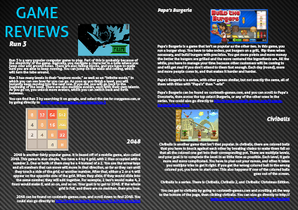 2048 is another fairly popular game. It is based off of a mobile game, also called 2048. This game is also simple. You have a 4 by 4 grid, with 2 tiles occupied with a number 2. One or both of them may be a 4 instead of a 2. You use the arrow keys and all numbers that can move will move in that direction, as far as they can until they touch a side of the grid, or another number. After that, either a 2 or a 4 will appear on the opposite side of the grid. When they slide, if they would slide into the same number, they will add together. For example, 2 two's would make 4, 2 fours would make 8, and so on, and so on. Your goal is to get to 2048. If the whole grid is full, and there are no matches, then you lose.