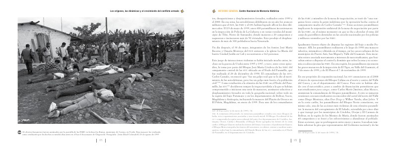Este juego de interacciones violentas se había iniciado mucho antes, incluso en la guerra de Urabá entre 1995 y 1997, y tuvo, entre otros episodios, la toma por parte del Bloque José María Córdova de las farc del campamento central de las auc ubicado en el Nudo del Paramillo, que fue realizada el 28 de diciembre de 1998. El comandante de las auc, Carlos Castaño, reconoció que“ fue un golpe real que se le dio al movimiento de las autodefensas, pero fue un golpe más fuerte a la población civil” 165. Como retaliación a la ofensiva de las farc en el Nudo del Paramillo, las auc 166 decidieron romper la tregua navideña a la que se habían comprometido e iniciaron una serie de masacres, asesinatos selectivos y desplazamientos forzados en toda la geografía nacional, sobre todo en la región del bajo Putumayo y en los departamentos de Bolívar, Sucre, Magdalena y Antioquia, incluyendo la masacre del Playón de Orozco en El Piñón, Magdalena, en enero de 1999. Para uno de los comandantes