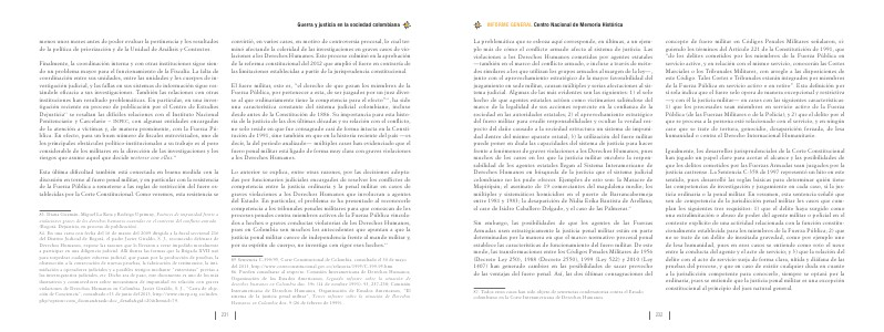 87. Todos estos casos han sido objeto de sentencias condenatorias contra el Estado colombiano en la Corte Interamericana de Derechos Humanos. concepto de fuero militar en Códigos Penales Militares señalaron, siguiendo los términos del Artículo 221 de la Constitutición de 1991, que“ de los delitos cometidos por los miembros de la Fuerza Pública en servicio activo, y en relación con el mismo servicio, conocerán las Cortes Marciales o los Tribunales Militares, con arreglo a las disposiciones de este Código. Tales Cortes o Tribunales estarán integrados por miembros de la Fuerza Pública en servicio activo o en retiro”. Esta definición por sí sola indica que el fuero solo opera de manera excepcional y restrictiva— y con él la justicia militar— en casos con las siguientes características: 1) que los procesados sean miembros en servicio activo de la Fuerza Pública( de las Fuerzas Militares o de la Policía); y 2) que el delito por el que se procesa a la persona esté relacionado con el servicio, y en ningún caso que se trate de tortura, genocidio, desaparición forzada, de lesa humanidad o contra el Derecho Internacional Humanitario.