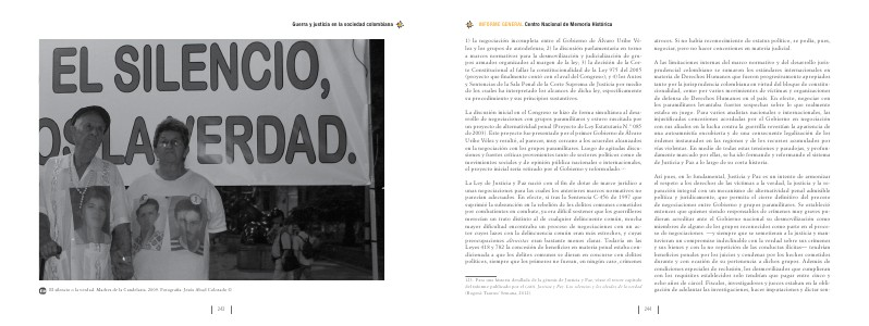 123. Para una historia detallada de la génesis de Justicia y Paz, véase el tercer capítulo del informe publicado por el gmh, Justicia y Paz. Los silencios y los olvidos de la verdad( Bogotá: Taurus / Semana, 2012). atroces. Si no había reconocimiento de estatus político, se podía, pues, negociar, pero no hacer concesiones en materia judicial.