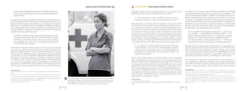 Se produce de esta manera una privatización del daño 19 que termina contaminando las decisiones personales, las relaciones familiares y los afectos. Esta privatización diluye e impide el reconocimiento de los verdaderos responsables; desubica a las personas en relación con el mundo y el trauma, y les impide interpretar lo vivido de manera ponderada y razonable. En lugar de tener en cuenta que los armados se impusieron arbitrariamente y que lo ocurrido no estaba en sus manos, no debía haber pasado y que les fue impuesto de manera injusta, las víctimas terminan percibiéndose como responsables de lo acontecido.