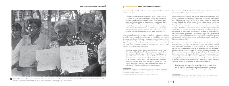 Las comunidades afectadas narran con gran dolor e indignación la forma en que los actores armados, y las élites que los respaldaron o instigaron, ejercieron su violencia. Sus burlas y ofensas expresaban el desprecio hacia sus prácticas religiosas y culturales, sus características fenotípicas y afiliaciones políticas. Esta afrenta en algunos casos fue experimentada y nombrada como sacrilegio, profanación y humillación, e incidió negativamente en las identidades individuales.
