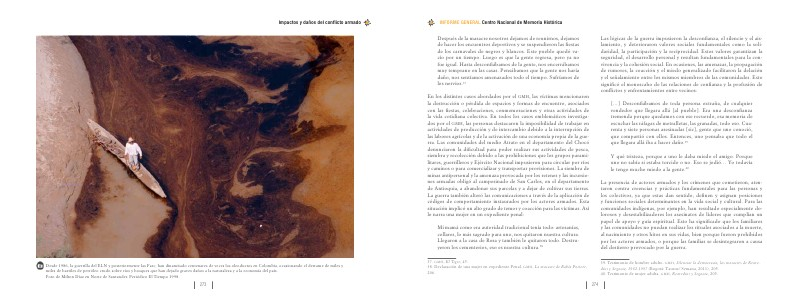 En los distintos casos abordados por el gmh, las víctimas mencionaron la destrucción o pérdida de espacios y formas de encuentro, asociados con las fiestas, celebraciones, conmemoraciones y otras actividades de la vida cotidiana colectiva. En todos los casos emblemáticos investigados por el gmh, las personas destacaron la imposibilidad de trabajar en actividades de producción y de intercambio debido a la interrupción de las labores agrícolas y de la activación de una economía propia de la guerra. Las comunidades del medio Atrato en el departamento del Chocó denunciaron la dificultad para poder realizar sus actividades de pesca, siembra y recolección debido a las prohibiciones que los grupos paramilitares, guerrilleros y Ejército Nacional impusieron para circular por ríos y caminos o para comercializar y transportar provisiones. La siembra de minas antipersonal y la amenaza provocada por los retenes y las incursiones armadas obligó al campesinado de San Carlos, en el departamento de Antioquia, a abandonar sus parcelas y a dejar de cultivar sus tierras. La guerra también alteró las comunicaciones a través de la aplicación de códigos de comportamiento instaurados por los actores armados. Esta situación implicó un alto grado de temor y coacción para las víctimas. Así lo narra una mujer en un expediente penal: