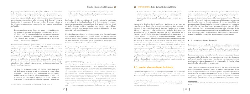 76. gmh, Mujeres y guerra, 257. 77.“ La guerra ha dejado 951 huérfanos en Colombia”, Noticias Caracol, consultado el 12 de mayo del 2013, http:// www. noticiascaracol. com / nacion / articulo-287846-laguerra-ha-dejado-951-huerfanos-colombia armados. Aunque es imposible determinar qué modalidad causa mayor daño, y resultaría improcedente establecer escalas y gradaciones de impacto y sufrimiento humano, algunas prácticas de violencia resultan especialmente ilustrativas de la capacidad para instalar el terror. Algunos métodos de ejercer la violencia pueden desestabilizar en forma extrema las vidas de las personas, destruir sus fuentes de apoyo e imposibilitar los mecanismos de elaboración de los duelos y los esfuerzos por recuperar la estabilidad y el control de los proyectos de vida, sean estos individuales o colectivos. Desde las experiencias narradas y las reflexiones de las víctimas podemos comprender que algunas modalidades como las masacres, las desapariciones y desplazamientos forzados y la violencia sexual 78 reúnen los múltiples y complejos impactos descritos previamente.
