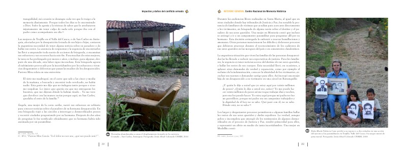 Las mujeres de Trujillo en el Valle del Cauca, o de San Carlos en Antioquia, afectadas por la desaparición forzada de sus hijos e hijas, contaron la angustiosa necesidad de tener alguna noticia sobre su paradero o de hallar sus restos. La ausencia de respuestas y la urgencia de encontrarlos las llevó a emprender toda suerte de acciones de búsqueda, a encaminar sus esfuerzos y sus recursos hacia este fin. Para muchas de estas mujeres, la tarea se ha prolongado por meses o años, e incluso, para algunas, después de una década, esta labor sigue inconclusa. Esta búsqueda agrava el sufrimiento provocado por la incertidumbre por los esfuerzos y vivencias desgastantes y dolorosas que pasan las madres de los desaparecidos. Pastora Mira relata en una entrevista: