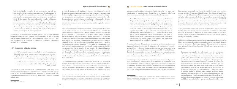 Impactos y daños del conflicto armado la identidad de los afectados. Y por supuesto, no son solo las coordenadas físicas las que se alteran con el desplazamiento a otra localidad, a otro municipio o a la ciudad, sino también las coordenadas sociales y de sentido que estructuran la conducta diaria de los sujetos. Tal vez resulte difícil para los habitantes citadinos sopesar lo que significa la condición de desplazado, pero es necesario recalcar que para el desplazado, el impacto de su experiencia es tal que al enfrentar un contexto distinto al de su esquema habitual, se ve impelido de alguna manera a reconfigurar su identidad personal. En últimas, el desplazamiento es el despojo de la vida propia. 103