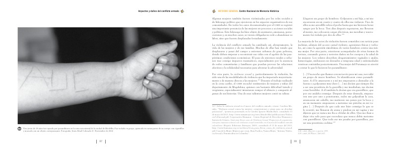 117. Sobre la violencia sexual en el marco del conflicto armado, véanse: Carolina Morales,“ Violencia sexual contra las mujeres: comprensiones y pistas para un abordaje psicosocial”,( ponencia presentada en la Cátedra Ignacio Martín-Baró, consultado 13 de mayo del 2013, http:// www. sismamujer. org / sites / default / files / publicaciones / Violencia % 20sexual. pdf; Corporación Humanas- Centro Regional de Derechos Humanos y Justicia de Género, Guía para llevar casos de Violencia Sexual. Propuestas de argumentación para enjuiciar crímenes de violencia sexual cometidos en el marco del conflicto armado colombiano( Bogotá: Ediciones Ántropos, 2009), consultado el 13 de mayo del 2013, http:// www. humanas. org. co / archivos / Guia _ para _ llevar _ casos _ de _ violencia _ sexual. pdf; Casa de la Mujer, Mujeres que crean, Ruta Pacífica, Vamos Mujer,“ Informe Violencia Sexual y Feminicidios en Colombia”.