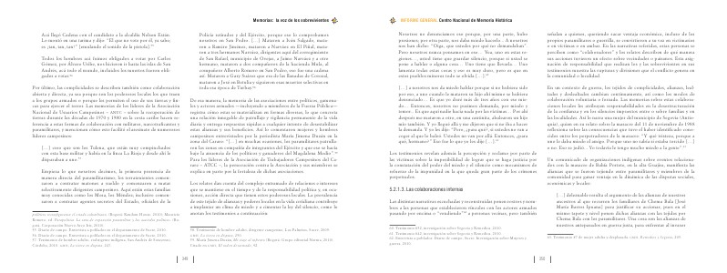 En un contexto de guerra, los tejidos de complicidades, alianzas, lealtades y deslealtades cambian continuamente, así como los modos de colaboración voluntaria o forzada. Las memorias sobre estas colaboraciones locales les atribuyen responsabilidades en la desestructuración de la confianza y en los silencios impuestos entre o sobre familias y en las localidades. Así lo narra una mujer del municipio de Segovia( Antioquia), quien en su relato sobre la masacre del 11 de noviembre de 1988 reflexiona sobre las consecuencias que tuvo el haber identificado conocidos entre los perpetradores de la masacre:“ Y qué tristeza, porque a uno le daba miedo el amigo. Porque uno no sabía si estaba torcido […] o no. Eso se jodió... Yo todavía le tengo mucho miedo a la gente”. 63