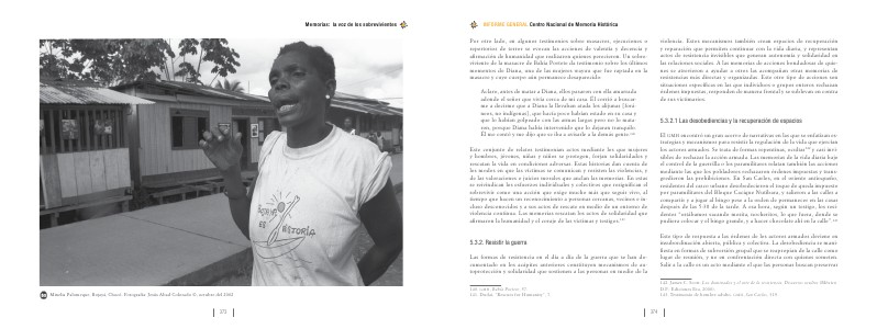 140. gmh, Bahía Portete, 57. 141. Dudai,“ Rescues for Humanity”, 7. violencia. Estos mecanismos también crean espacios de recuperación y reparación que permiten continuar con la vida diaria, y representan actos de resistencia invisibles que generan autonomía y solidaridad en las relaciones sociales. A las memorias de acciones bondadosas de quienes se atrevieron a ayudar a otros las acompañan otras memorias de resistencias más directas y organizadas. Este otro tipo de acciones son situaciones específicas en las que individuos o grupos enteros rechazan órdenes impuestas, responden de manera frontal y se sublevan en contra de sus victimarios.