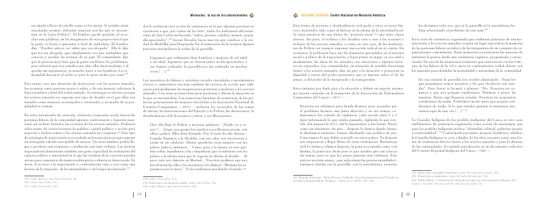 Memorias: la voz de los sobrevivientes eso implica llevar el cabello como se les antoje. Si ustedes están enseñando normas, deberían empezar por las que se encuentran en la Carta Política”. El hombre quedó perplejo al escuchar esas palabras; en los imaginarios de esos grupos está el que la gente es bruta e ignorante y fácil de embolatar. El hombre dijo:“ Perdón señora, no sabía que era abogada”. Ella le dijo que no era abogada, que simplemente era una ciudadana que conocía y acataba las normas de su país. El comandante dijo que le parecía muy bien que la gente resolviera los problemas, pero advirtió que si se armaba una riña, ellos intervendrían, y al quedar sin argumentos, se marchó junto a sus hombres. La comunidad descansó al verlos ir, pero lo peor estaba por venir. 155