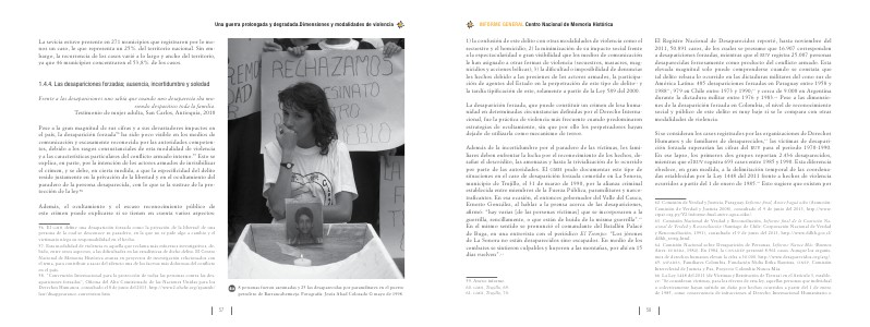 56. El gmh define una desaparición forzada como la privación de la libertad de una persona de la cual se desconoce su paradero, en la que no se pide algo a cambio y el victimario niega su responsabilidad en el hecho. 57. Esta modalidad de violencia es aquella que reclama más esfuerzos investigativos, debido, entre otros aspectos, a las dificultades en las estadísticas de dicho delito. El Centro Nacional de Memoria Histórica avanza en proyectos de investigación relacionados con el tema, para contribuir a sacar del silencio una de los facetas más dolorosas del conflicto en el país. 58.“ Convención Internacional para la protección de todas las personas contra las desapariciones forzadas”, Oficina del Alto Comisionado de las Naciones Unidas para los Derechos Humanos, consultado el 8 de junio del 2013, http:// www2. ohchr. org / spanish / law / disappearance-convention. htm