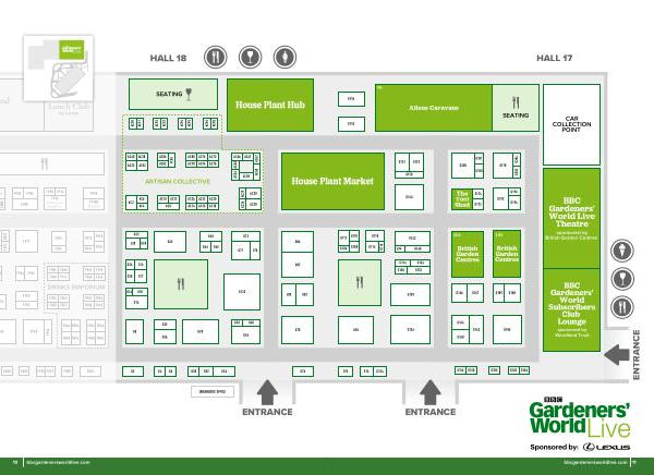 HALL 17 ENTRANCE ENTRANCE G150 G178 G202 G200 G134 G126 G128 G146 G124 G92 G142 G106 G118 G114 G96 G156 G184 G132 G172 G174 G167 G166 G162 G160 G164 G192 G194 G196 G186 G190 G136 G168 G204 G151 G185 G94 G158 G182 G180 G116 G112 G110 G108 G188 G189 G153 G154 G34 G152 G140 G141 G181 G130 BBC Gardeners ' World Subscribers Club Lounge sponsored by Woodland Trust BBC Gardeners ' World Live Theatre sponsored by British Garden Centres SEATING CAR COLLECTION POINT Allens Caravans British Garden Centres British Garden Centres ant Market The Tool Shed bbcgardenersworldlive . com 11