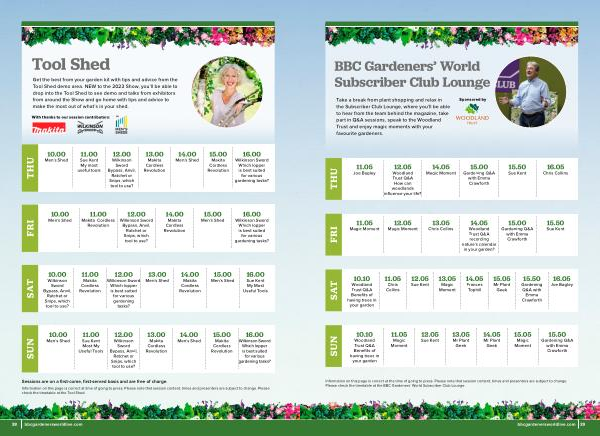 Information on this page is correct at the time of going to press . Please note that session content , times and presenters are subject to change . Please check the timetable at the BBC Gardeners ’ World Subscriber Club Lounge .