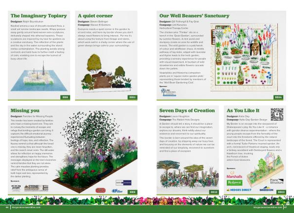 The chicken wire ‘ Thinker ’ sits on a bench in the ‘ Quiet Garden ’, surrounded by summer flowers . A mini pond and stumpery create an area for wildlife and insects . The wild garden is a patchwork of colour and wildflower chaos . A middle pathway of log slabs , edged with lavender and thyme leads to the herb garden , providing a sensory experience for people with visual impairment . A fountain of wild strawberries and edible flowers cascade down the pallets .