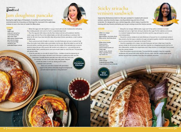 1 Whisk the eggs and milk together in a jug or bowl until smooth . Combine the self-raising flour , baking powder and a pinch of salt in a separate large bowl . 2 Pour the egg and milk mixture into the flour mixture and stir until combined . Add the caster sugar and stir . Pour in the melted butter and stir until everything is combined . Set aside for 30 mins if you have time ( this step will produce thicker pancakes ), or start cooking straight away . 3 Heat a generous knob of butter in a large , non-stick frying pan set over a medium heat . When the butter looks frothy , ladle some batter into the pan . Allow the batter to cook for 30 seconds before carefully spooning 2 tsp jam into the middle of the pancake ( use a second spoon to tease the jam off its spoon ). Be careful not to dollop it on – you want the jam to spread slightly . Next , carefully spoon over just enough batter to cover the jam . The pancake will spread a little . 4 Cook the pancake on one side for about 2 mins – bubbles should be appearing on the surface and the edges will start to set . If the base is getting too dark , turn the heat down . Carefully flip the pancake over with a fish slice and cook for a further 1-2 mins on the other side until golden . Repeat until all the batter is used up , wiping out the butter between each pancake . 5 Serve your pancakes topped with granulated sugar for the perfect chanukah doughnut ( sufganiyot )/ pancake hybrid experience . Chag Sameach !
