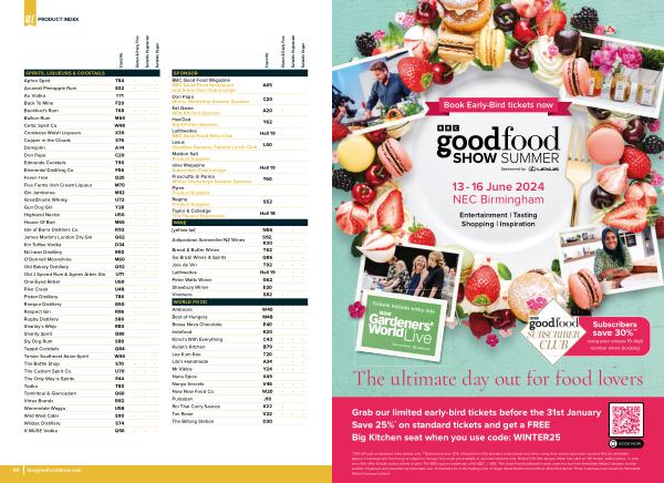 * 25 % off valid on standard entry tickets only . ** Subscribers save 30 % off adult / over 65s standard entry tickets only when using their unique subscriber number . Not all celebrities appear on all days and the line-up is subject to change , free seats are available in selected sessions only . Ends 23:59 31st January 2024 . Not valid on VIP tickets , added extras , or with any other offer . Details correct at time of print . The BBC logo is a trademark of the BBC . © BBC . The Good Food trademark is used under licence from Immediate Media Company London Limited . Organised and presented by Immediate Live . Immediate Live is the trading name of Upper Street Events Ltd and River Street Events Ltd . These businesses are owned by Immediate Media Company Limited .