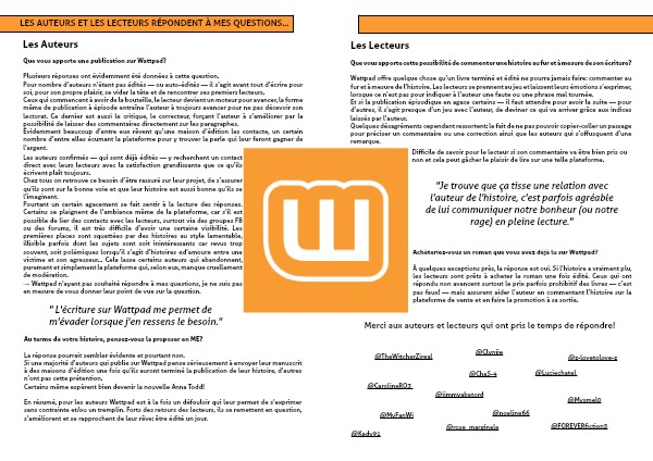 En résumé, pour les auteurs Wattpad est à la fois un défouloir qui leur permet de s’exprimer sans contrainte et/ou un tremplin. Forts des retours des lecteurs, ils se remettent en question, s’améliorent et se rapprochent de leur rêve : être édité un jour.