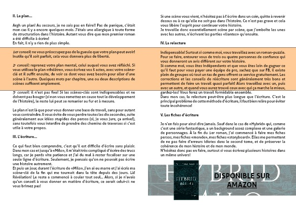 Je n’en fais pour ainsi dire jamais. Sauf dans le cas de « Hybrid » qui, comme c’est une série fantastique, a un background assez complexe et une galerie de personnages. À la fin du 1er roman, j’ai commencé à faire mes fiches persos, mes fiches « monde », mes fiches « storyboard ». Elles me permettent de ne pas faire d’erreurs idiotes dans le second tome, et de préserver la cohérence de mon histoire et de mon monde.