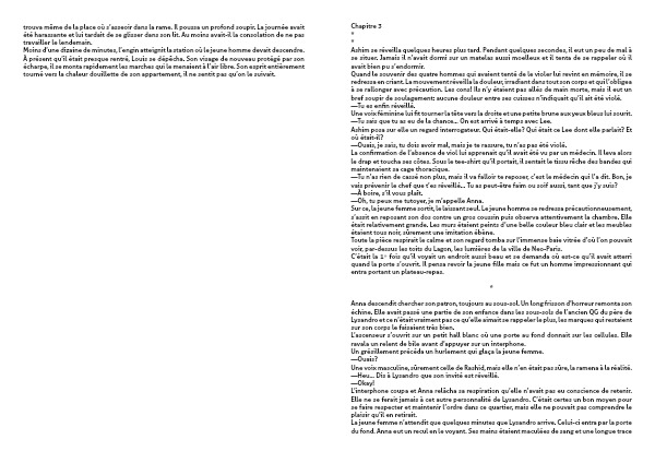 Toute la pièce respirait le calme et son regard tomba sur l’immense baie vitrée d’où l’on pouvait voir, par-dessus les toits du Lagon, les lumières de la ville de Neo-Paris.