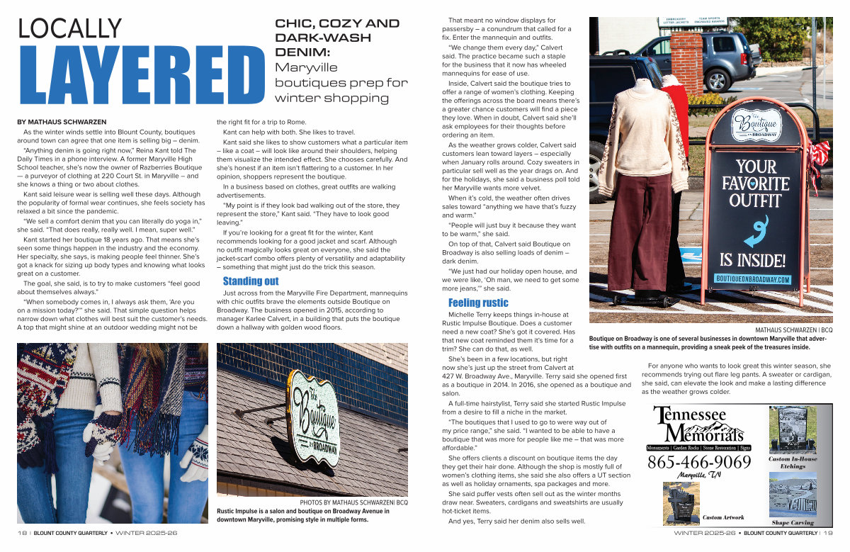 As the weather grows colder, Calvert said customers lean toward layers – especially when January rolls around. Cozy sweaters in particular sell well as the year drags on. And for the holidays, she said a business poll told her Maryville wants more velvet.